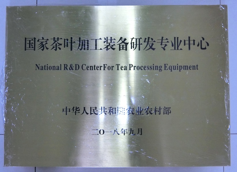 2018年10月我司獲評(píng)中華人民共和國(guó)農(nóng)業(yè)農(nóng)村部:“國(guó)家茶葉加工裝備研發(fā)專(zhuān)業(yè)中心”。
