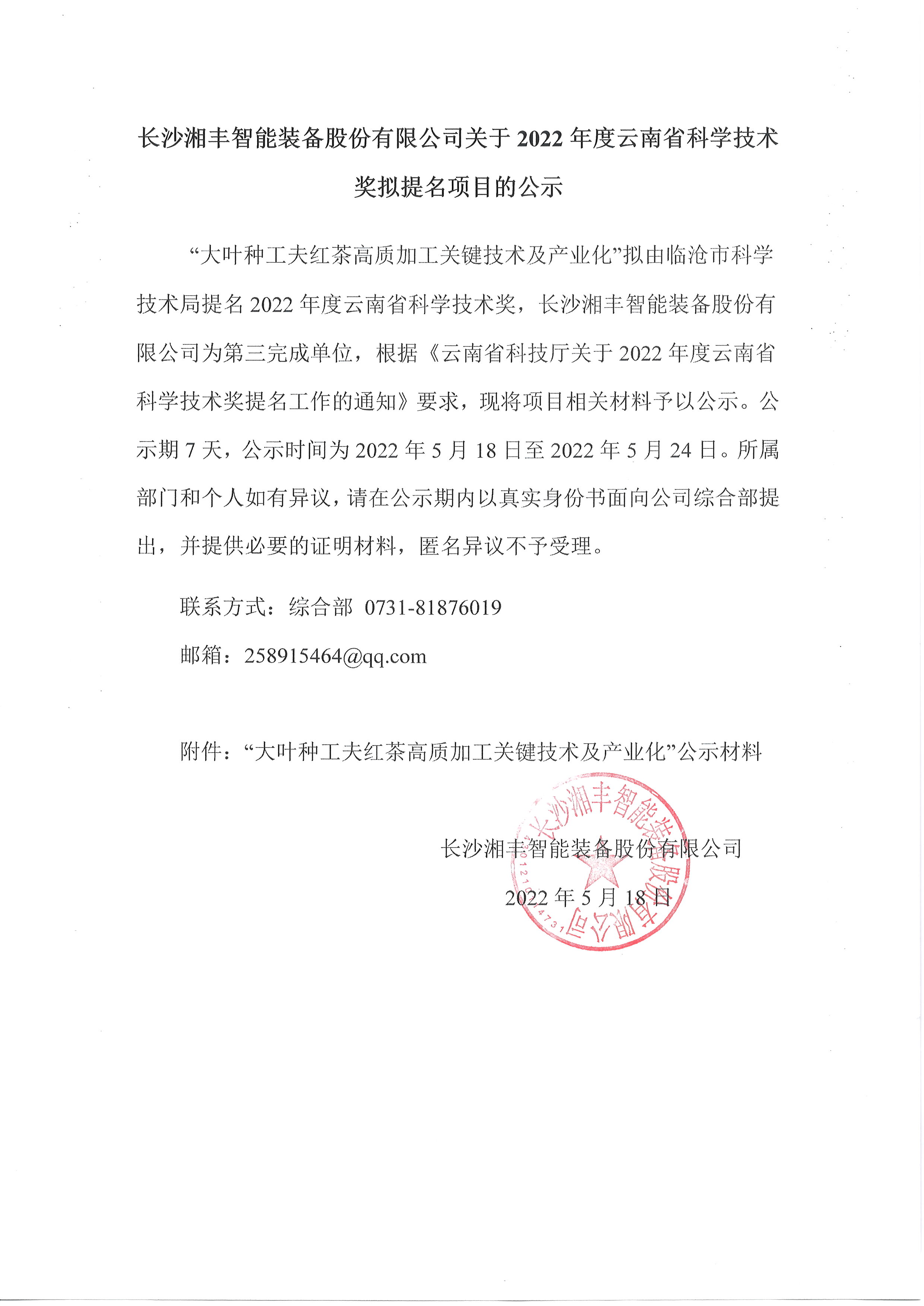長沙湘豐智能裝備股份有限公司關(guān)于2022年度云南省科學(xué)技術(shù)獎(jiǎng)擬提名項(xiàng)目的公示