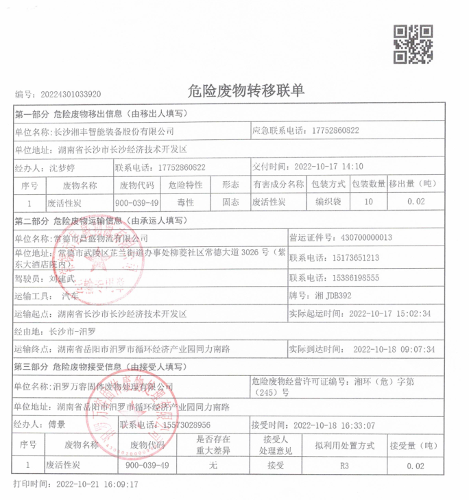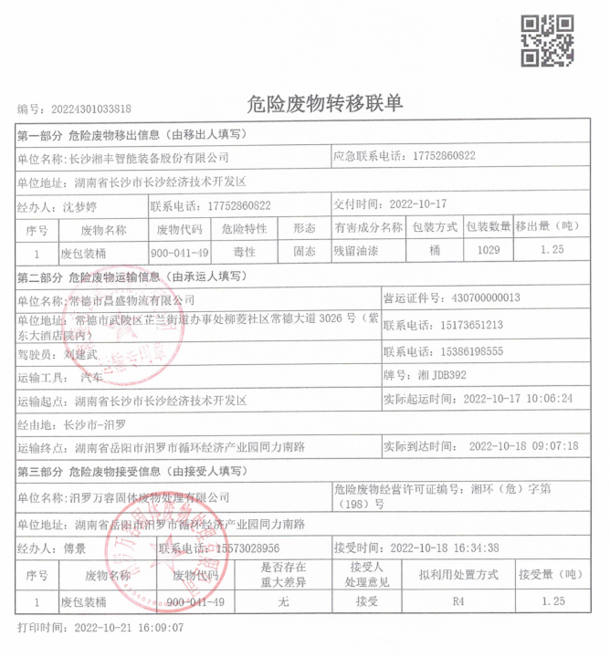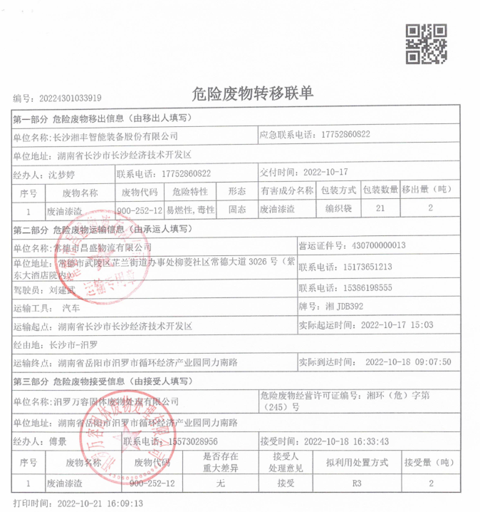 長沙湘豐智能裝備股份有限公司2022年度危廢轉(zhuǎn)移公示