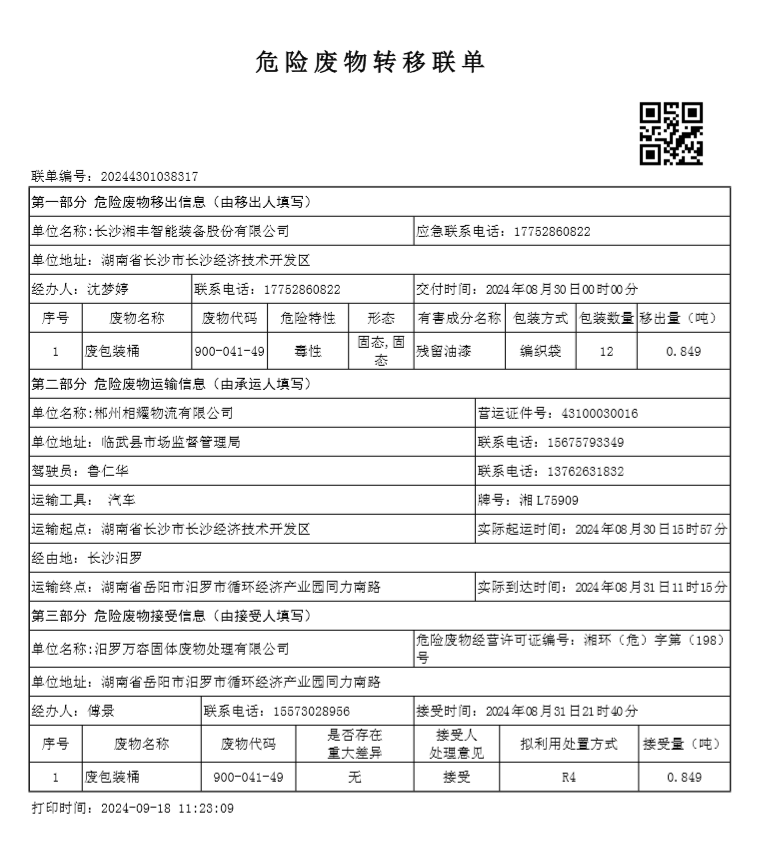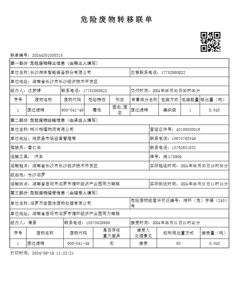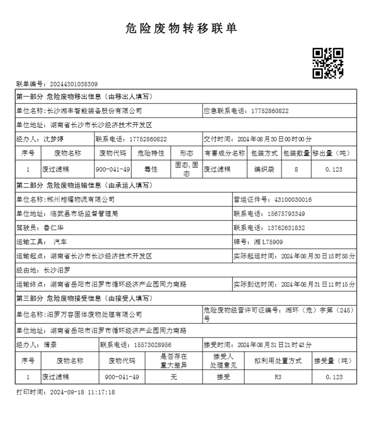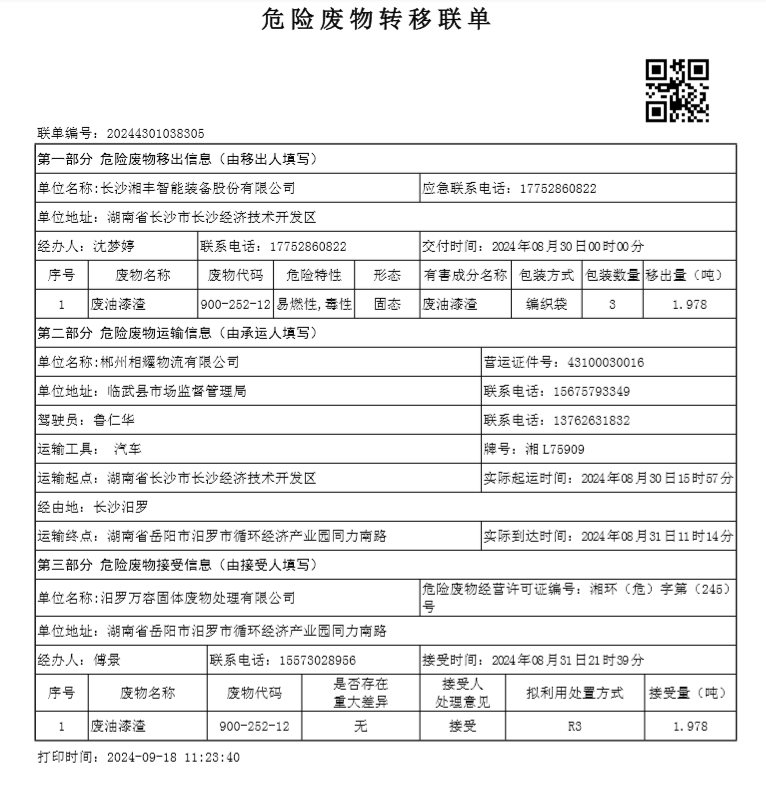 長沙湘豐智能裝備股份有限公司2024年度危廢轉(zhuǎn)移公示